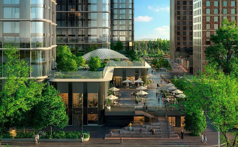 зеленый двор. На первых этажах зданий разместятся кафе, салон красоты, аптека,