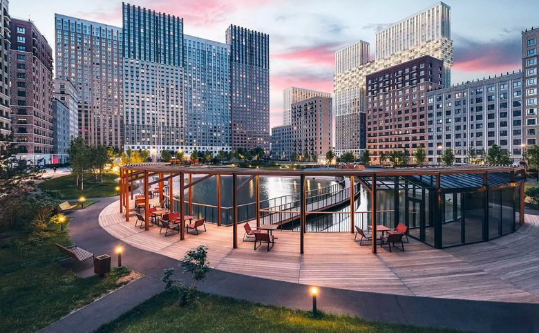 Жилой комплекс представляет собой коллекцию домов разной этажности — от небоскребов до среднеэтажных строений. Для жителей комплекса предусмотрены 2 частных детских сада, школа, студия йоги, фитнес-центр, кафе и магазины. Обустроены коворкинг, зоны отдыха у пруда, кладовые и помещения для хранения колясок. Территория закрыта от посторонних, оснащена круглосуточным видеонаблюдением и системой контроля доступа. Владельцам авто доступен подземный паркинг на 1713 мест.